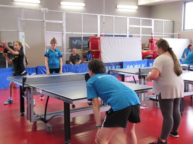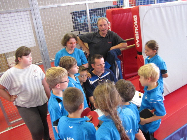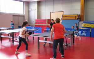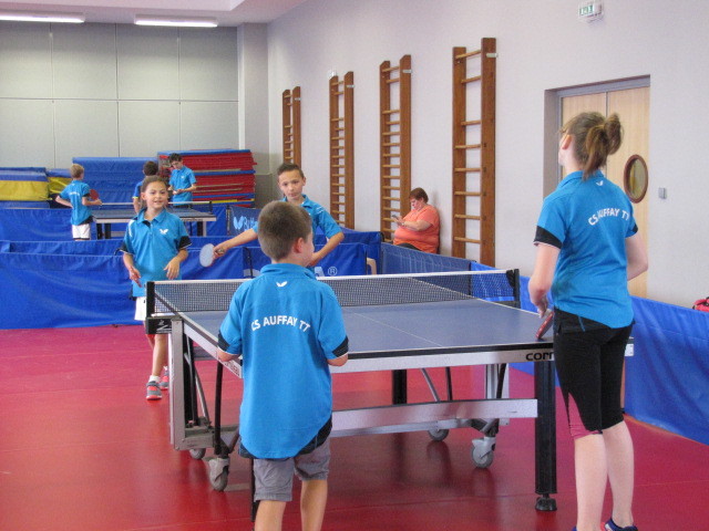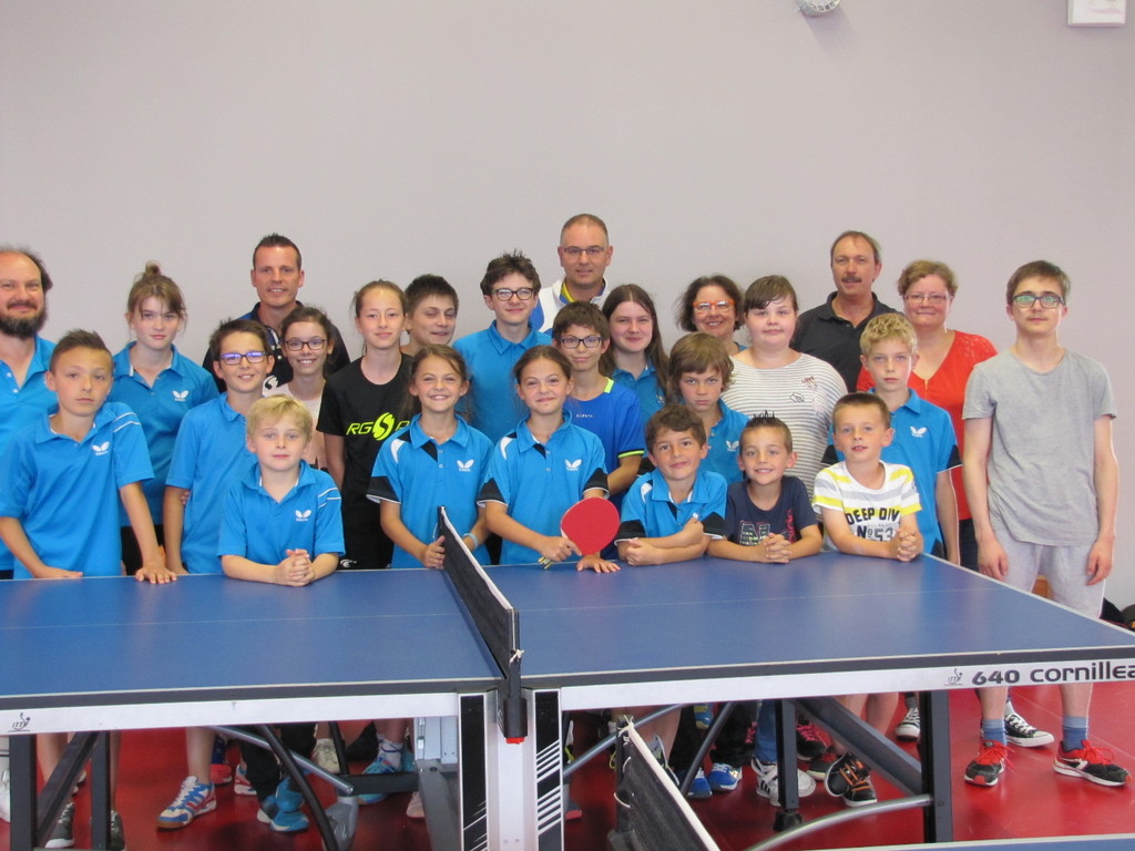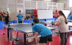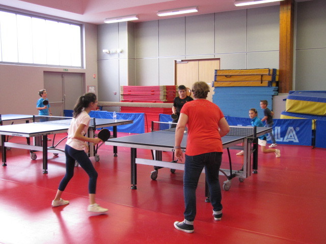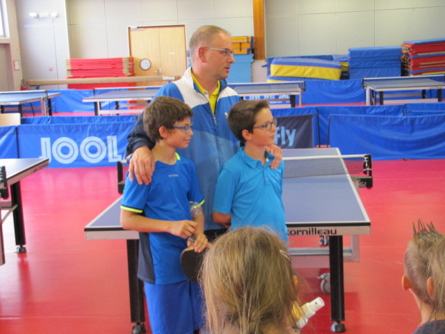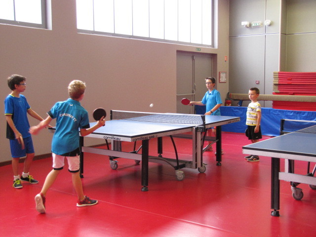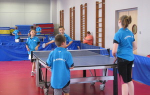Ce fût le prétexte pour un tournoi formule « coupe Davis », qui a réuni les deux groupes d'enfants (et plus...) de l'école pongiste. Des équipes de deux joueurs de niveaux différents étaient constituées par Cédric, et se rencontraient de la façon suivante : les deux joueurs de niveau plus modeste se jouaient jusqu'à ce que l'un d'eux atteigne 11 points, puis les deux autres enchaînaient à partir du score déjà obtenu jusqu'à 22 points, et enfin la partie se terminait sur un double jusqu'à 33 points. Les échanges se sont poursuivis une bonne partie de l'après-midi dans une ambiance détendue, jusqu'à l'annonce des résultats, cloturée par une photo de groupe.